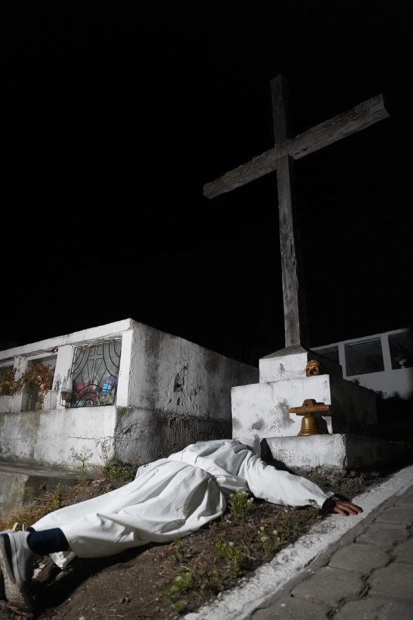 Su ascenso se da con pasos rápidos hacia la cruz más alta del cementerio, se acuesta boca abajo mientras pronuncia sus oraciones e inicia su recorrido por el pueblo, la campanilla repica en cada esquina, como convocando a quienes parten al descanso. Se detiene, canta, espera una plegaria de alguien que abre su puerta, recibe una limosna y sigue adelante. Al llegar al cementerio, se inicia el canto final bajo la medianoche. El traje blanco simboliza pureza y mediación espiritual; el cíngulo marca la disciplina y constancia con la que se asume este rol.
