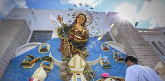 Virgen María y personas de primera línea se ubican en el...