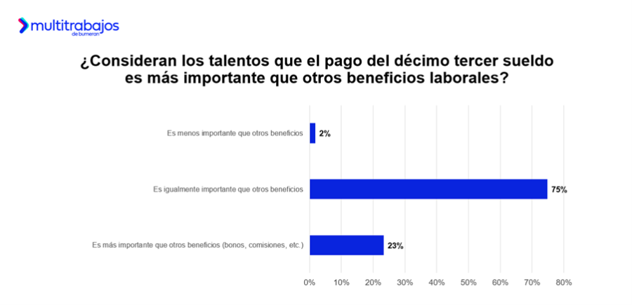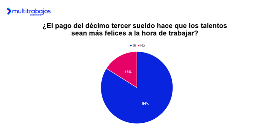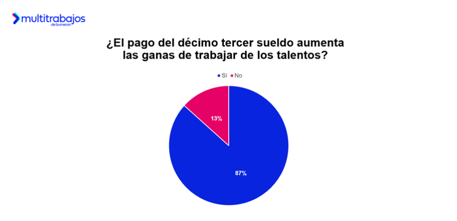 Además, según el estudio Décimo Tercer Sueldo de Multitrabajos, el 87% de los talentos asegura que este beneficio laboral aumenta sus ganas de trabajar.