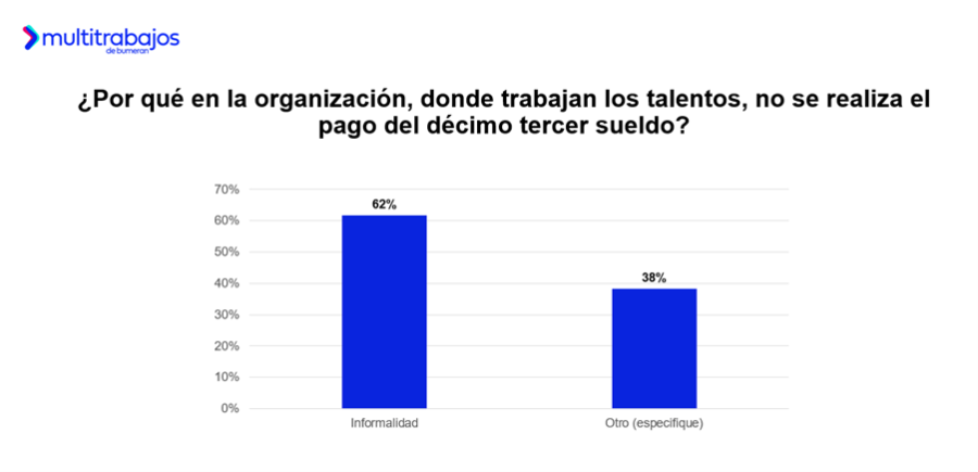 Entre las razones por las que no reciben este beneficio, el 62% de los talentos identificó como principal motivo la informalidad laboral, mientras que el 38% mencionó otros motivos. Esta cifra es consistente con el último reporte del Instituto Nacional de Estadísticas y Censos (INEC) que en octubre señaló que el 51,5% de las personas con empleo se encuentra en el sector informal de la economía.
