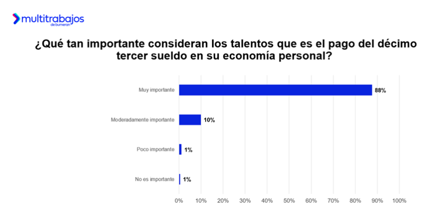 El 88% de los talentos considera el décimo como un aspecto muy importante para su economía; el 10% lo califica como moderadamente importante; y el 2% lo percibe como poco o nada relevante.