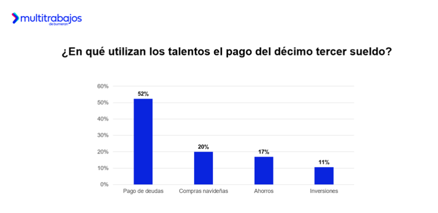 ¿Para qué utilizan el décimo los talentos? El 52% de las personas trabajadoras destina el décimo tercer sueldo al pago de deudas; el 20% lo utiliza para compras navideñas; el 17% lo ahorra; y el 11% lo invierte para generar rentabilidad a futuro.