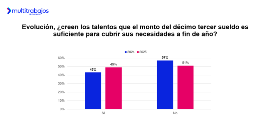 En 2024, el 57% de los talentos señalaba que el monto del décimo tercer sueldo no les era suficiente para cubrir sus necesidades de fin de año, seis puntos porcentuales más que en 2025 (51%).