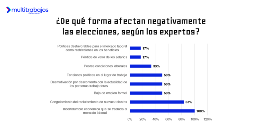 Según el estudio Elecciones 2025: ┬┐Cómo afectan al mercado laboral? de Multitrabajos, el portal líder de empleo en Latinoamérica, el 50% de especialistas en recursos humanos considera que las elecciones tienen un impacto negativo sobre el mercado laboral, mientras que un 33% mantiene una postura neutral y un 17% cree que su efecto es positivo.