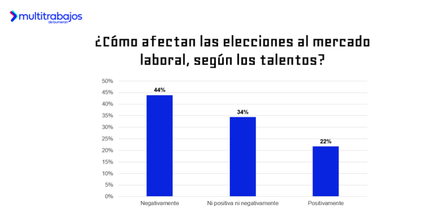 Desde la perspectiva de las personas trabajadoras, el 44% cree que las elecciones afectarán negativamente el mercado laboral. Sin embargo, el 22% tiene una visión optimista. Por otro lado, el 34% de los encuestados mantiene una postura neutral.