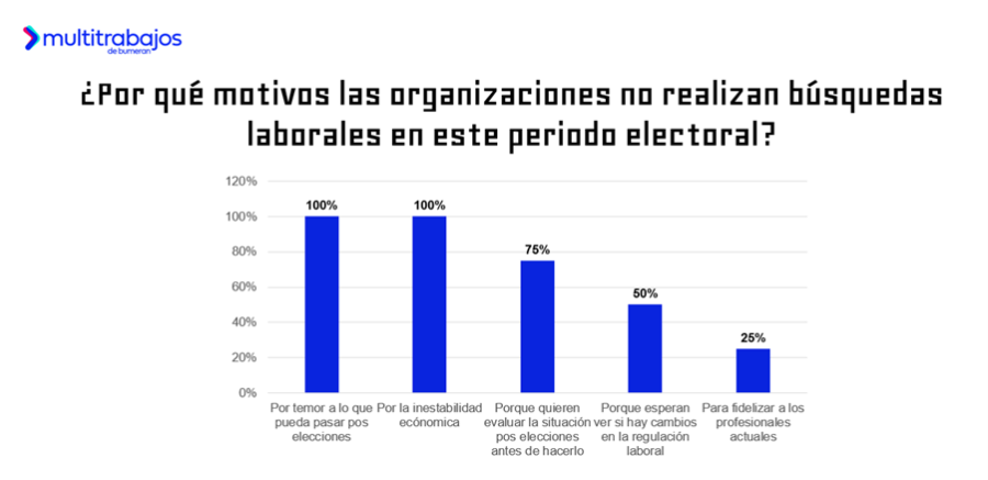 Entre quienes no tienen previsto realizar contrataciones, el 100% menciona el temor a lo que pueda pasar pos elecciones y la inestabilidad económica; el 75% prefiere evaluar la situación después de las elecciones; el 50% espera ver si hay cambios en la regulación laboral y el 25% busca fidelizar a los profesionales actuales.