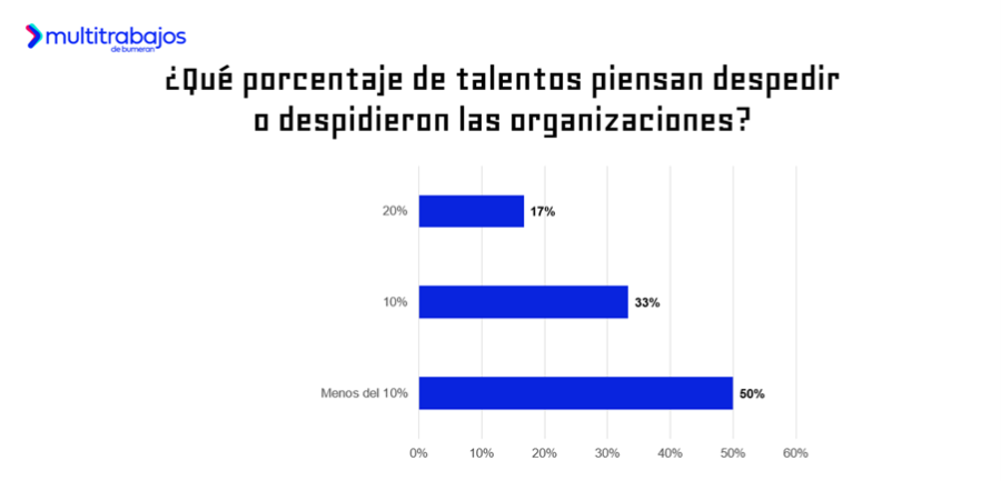 En esta línea, el 60% de empresas prevé realizar ajustes en su equipo de trabajo, mientras que un 40% mantendrá su estructura actual. Entre quienes sí modificarán su nómina, se estima que más del 50% de empresas reducirá menos del 10% de su plantilla; un 33% de organizaciones reduciría un 10% de su equipo y un 17% de organizaciones aplicará una reducción del 20% en su equipo.
