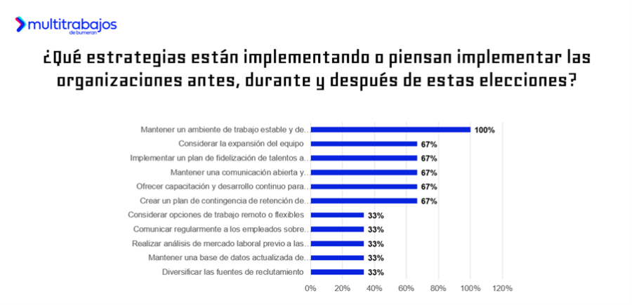 Entre las organizaciones que sí tienen previsto implementar estrategias, se incluye mantener un ambiente de trabajo estable y de apoyo (100%); así como desarrollar un plan de contingencia para retener talentos clave (67%); ofrecer capacitación y desarrollo continuo al personal (67%) ; garantizar una comunicación abierta y transparente con los colaboradores (67%); implementar un plan de fidelización de talentos a largo plazo (67%); y evaluar la posibilidad de expandir el equipo (67%).