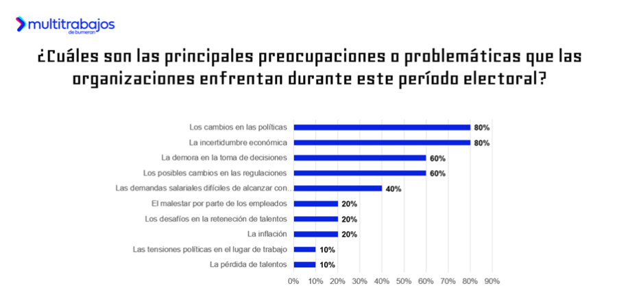 Frente al escenario electoral, las organizaciones registran varias preocupaciones: el 80% menciona cambios en las políticas e incertidumbre económica; el 60% destaca la demora en la toma de decisiones y posibles cambios en las regulaciones; el 40% menciona demandas salariales difíciles de alcanzar; el 20% señala malestar entre los talentos, desafíos en la retención de talentos y la inflación, mientras que el 10% menciona la pérdida de talento y tensiones políticas en el entorno laboral.