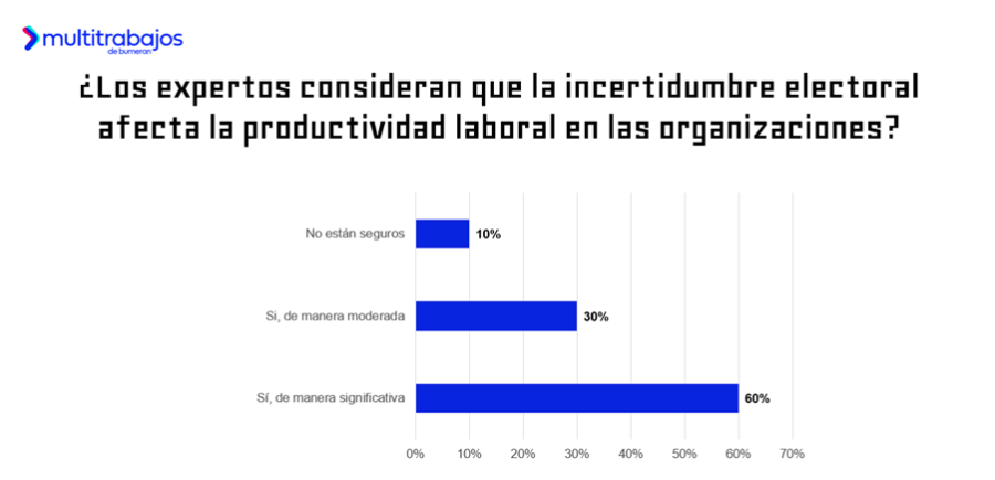 En términos de productividad, el 60% de expertos en recursos humanos mencionan que las elecciones tienen un impacto significativo; el 30% señala una afectación moderada y solo el 10% considera que los comicios no influyen en sus actividades.