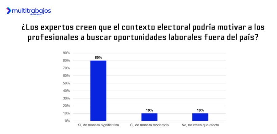 En este contexto, según los expertos en Recursos Humanos, las elecciones podrían influir en la retención del talento. El 80% considera que este período podría motivar a algunos talentos a considerar oportunidades en el extranjero, frente a un 10% que cree que el impacto será moderado y sólo otro 10% opina que las elecciones no tendrán efecto.