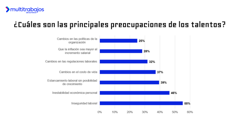 ┬┐Cuáles son las principales preocupaciones de las personas trabajadoras en relación a las elecciones? Un 55% señala la inseguridad laboral, un 46% menciona la inestabilidad económica personal, el 39% hace referencia al estancamiento laboral sin posibilidad de crecimiento y un 37% habla sobre cambios en los costos de vida.