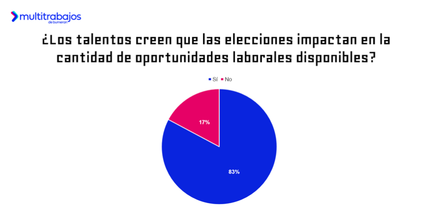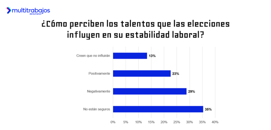 En este contexto, entre los talentos existen opiniones diversas sobre la influencia que tendrá el proceso electoral en su estabilidad laboral: el 29% de los talentos considera que las elecciones influirán negativamente, mientras que el 23% cree que esta influencia será positiva. Por otra parte, el 35% no está seguro y el 13% menciona que las elecciones no influirán.