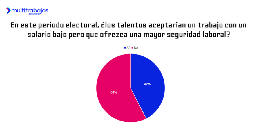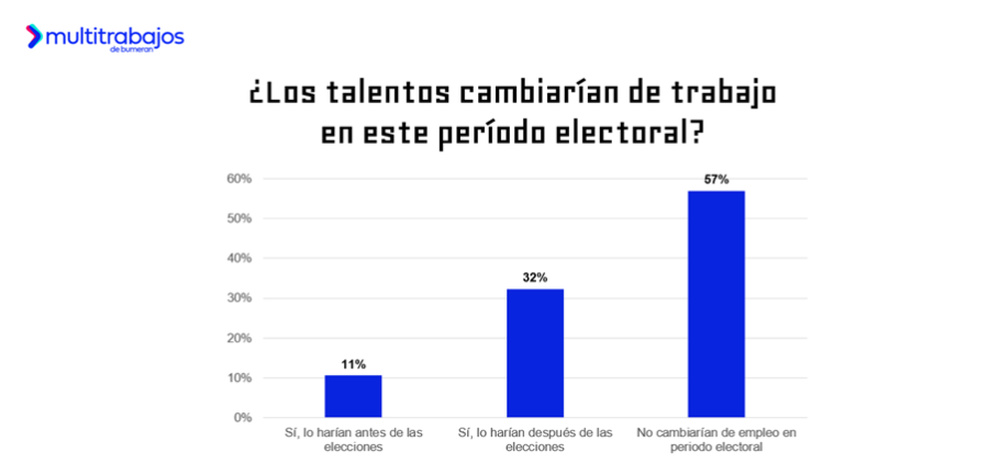 La mayoría de los talentos optará por mantenerse en su empleo actual. El 57% de los encuestados afirmó que no cambiaría de trabajo durante el período electoral, mientras que el 32% mencionó que sí lo haría, pero después de que finalice el proceso. Solo el 11% consideraría cambiar de empleo antes de las elecciones.