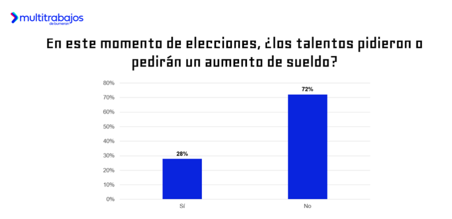 ┬┐Los talentos planean pedir un aumento de sueldo en este período? El 72% de los trabajadores prefiere esperar otro momento para solicitar un aumento, mientras que un 28% aún está dispuesto a negociar su salario durante este período.