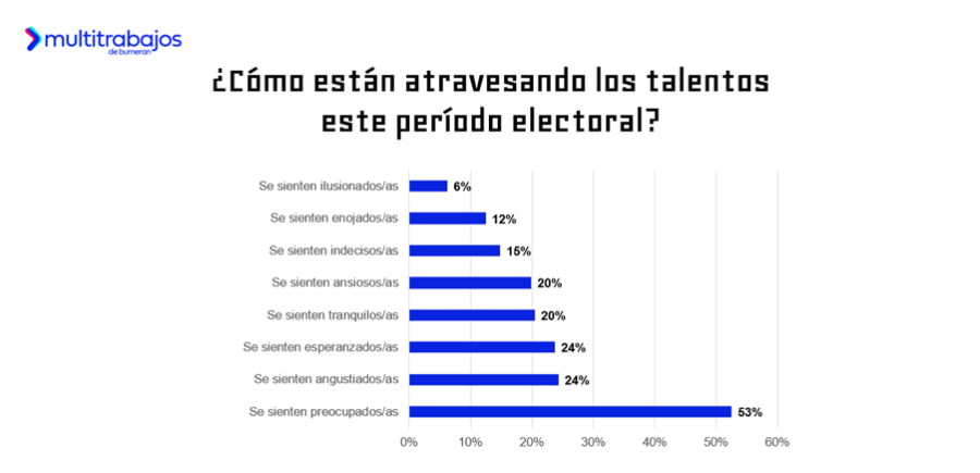 El período electoral influye en el estado de ánimo de las personas trabajadoras: el 52% dicen sentirse preocupados; el 24% se sienten angustiados; otro 20% están ansiosos; un 15% se sienten indecisos; y un 12% enojados. Por otra parte, un 24% se sienten esperanzados, un 20% están tranquilos y un 6% ilusionados.