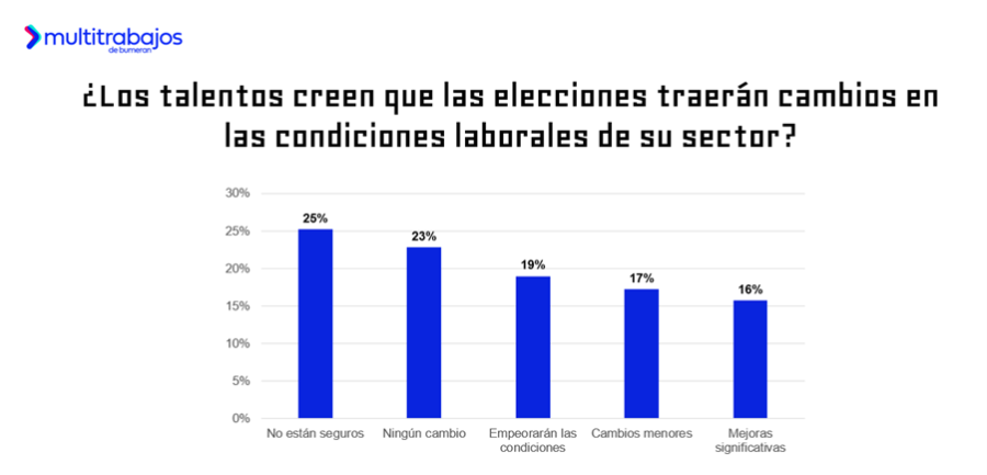 Por este motivo, los talentos se muestran cautelosos ante los posibles cambios que puedan traer las elecciones a sus condiciones laborales. Un 25% no está seguro de si las elecciones generarán cambios, el 23% cree que no habrá modificaciones, el 19% considera que las condiciones laborales empeorarán, el 17% opina que habrá modificaciones menores y solo el 16% espera mejoras significativas.