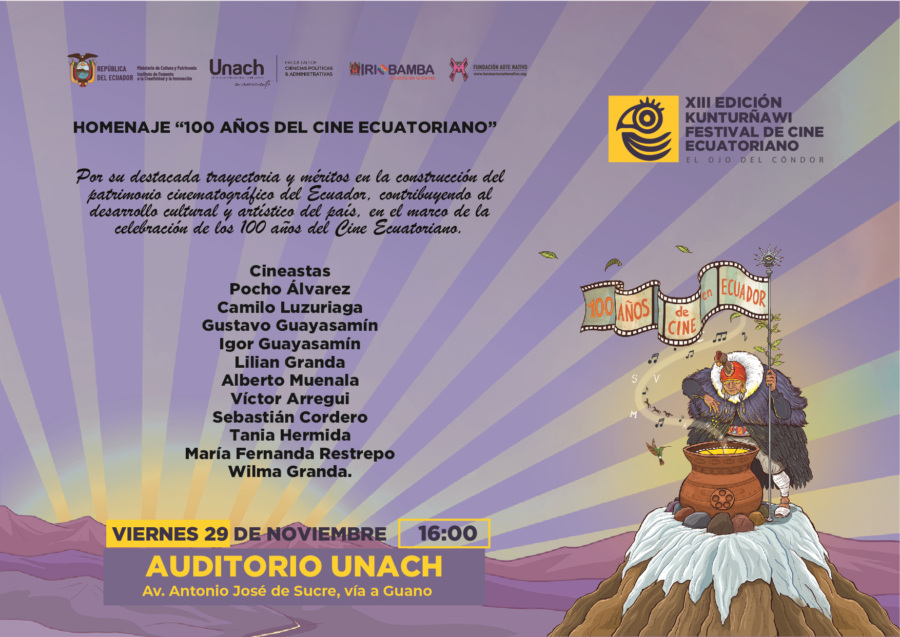 En el marco del centenario del cine ecuatoriano, el país rinde un merecido homenaje a destacados cineastas cuya trayectoria y méritos han contribuido significativamente a la construcción del patrimonio cultural y cinematográfico nacional. Este evento histórico, organizado por el Ministerio de Cultura y Patrimonio, el Municipio de Riobamba, la Fundación Arte Nativo y la Universidad Nacional de Chimborazo (UNACH), se llevará a cabo este viernes 29 de noviembre a las 16h00 en el Auditorio Edison Riera de la UNACH, en Riobamba.