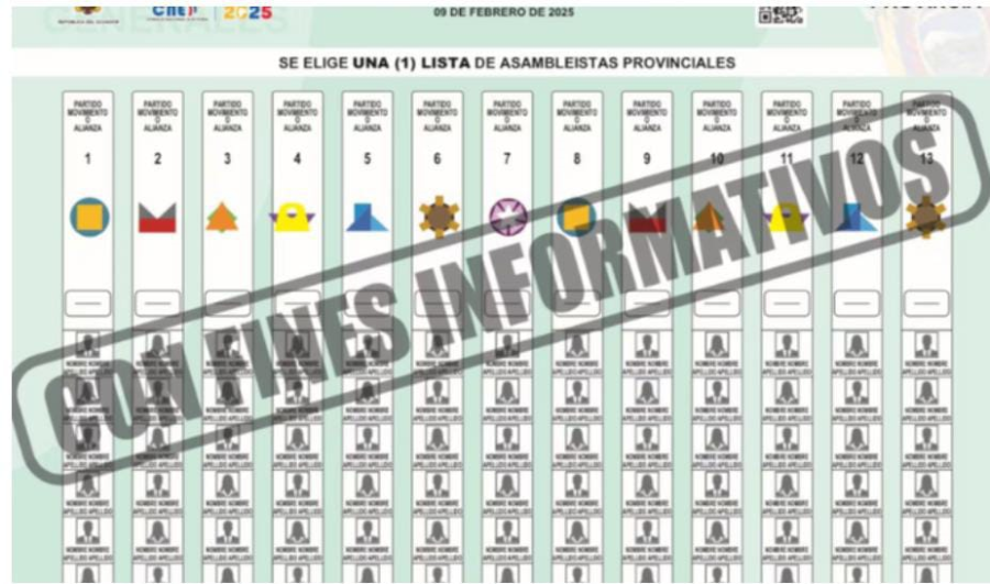 Parlamentarios Andinos: Color café. Estos colores distintivos están diseñados para ayudar a los votantes a identificar rápidamente las papeletas y reducir la confusión durante el proceso de votación. El CNE ha implementado diversas medidas de seguridad en las papeletas para garantizar la integridad del proceso electoral. Entre estos elementos se incluyen efectos anticopia, micro textos con diferentes tramados, anti-scanner y códigos de barras, todos desarrollados por el Instituto Geográfico Militar (IGM). Adicionalmente, cada junta receptora del voto contará con dos biombos y dos urnas para facilitar el proceso de votación.