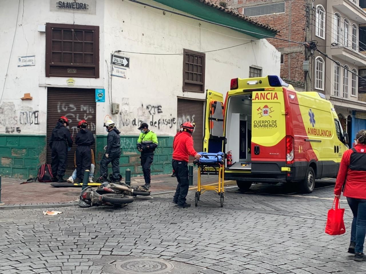 Por medio de los bomberos, se conoció que tras un llamado de auxilio en las calles Larrea y Veloz, se movilizaron al punto, ya que en ese lugar se dio un accidente de tránsito entre un vehículo tipo sedán y una motocicleta.┬áLos miembros de la institución bomberil atendieron al ciudadano que se movilizaba en moto, el cual producto del golpe, tuvo múltiples contusiones y fue estabilizado por el equipo de paramédicos.┬á