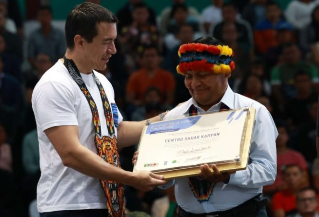 Por su parte, Mateo Yancora, presidente del centro shuar Tunants, agradeció públicamente al mandatario: “Señor Presidente, estamos agradecidos por darnos la oportunidad de legalizar nuestro territorio. Morona Santiago une sus fuerzas por este nuevo Ecuador”.