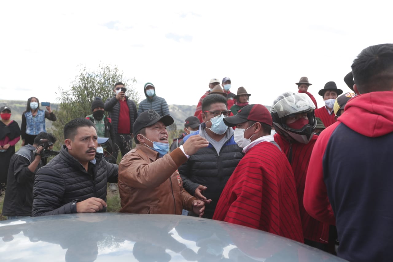 El carro que obstaculizó el acceso era conducido por el alcalde de Guamote, Delfín Quishpe, quien estaba acompañado de otros automotores con pancartas y consignas en contra de Guillermo Lasso.
