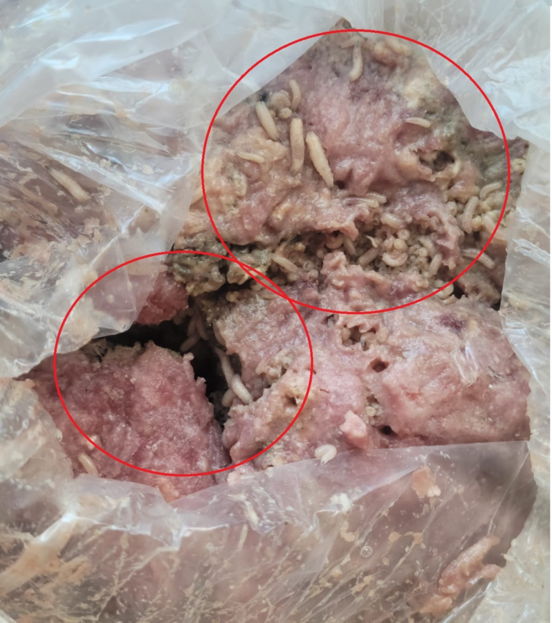 Una ama de casa del cantón Pastaza denunció la venta de piltrafas contaminadas con gusanos en un local del sector del mercado de los plátanos, en la ciudad de Puyo. La mujer, que prefirió mantener su nombre en reserva, relató que adquirió la carne con la intención de alimentar a sus mascotas, pero al llegar a casa y abrir la funda, se encontró con la desagradable sorpresa: el producto estaba infestado de larvas.