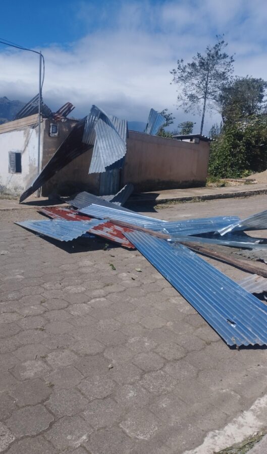 A las 13:07, desde el caserío San Vicente, cantón Pallatanga, se reportó a la central de emergencias 9-1-1 que los fuertes vientos afectaron las viviendas de cuatro familias y dañaron instalaciones que sirven para la crianza de animales de granja.