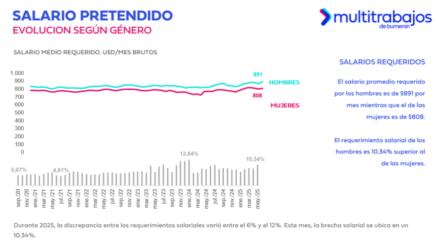 Además, estas cifras revelan una brecha del salario promedio requerido según género de 10,34% a favor de los varones. En abril de 2025, la brecha salarial por género alcanzó el 8,44%. Con respecto al mes previo, la brecha salarial por género se incrementó en un 1,90 puntos porcentuales en mayo de 2025.