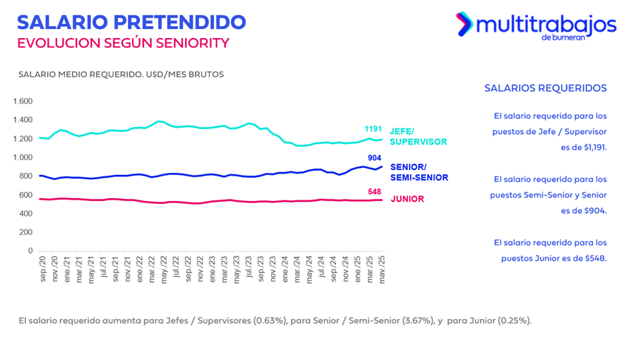 El salario promedio requerido en roles de jefe o supervisor fue de USD 1.191, reflejando un aumento del 0,63% en comparación con abril de 2025. Para las posiciones semi senior y senior, se fijó en USD 904, registrando un incremento de 3,67% con relación al mes previo. En los niveles junior, el salario mensual se situó en USD 548, evidenciando un ligero crecimiento de 0,25% en comparación con el mes anterior.