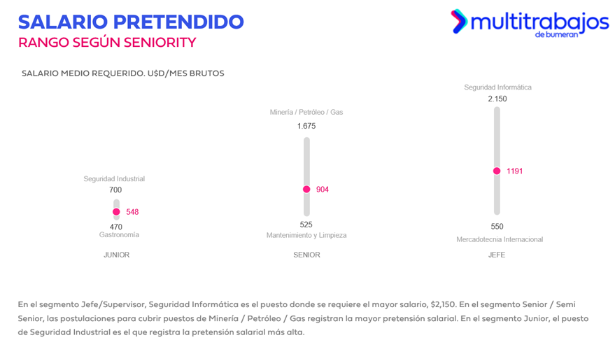 Dentro del seniority de jefe o supervisor, el puesto de Seguridad informática se destaca con el salario pretendido más alto, alcanzando los USD 2.150. En el segmento de senior y semisenior, el rol de Minería/Petróleo/Gas muestra la mayor pretensión salarial, situándose en USD 1.675. En el nivel junior, el puesto de Seguridad industrial lidera con la pretensión salarial más elevada, llegando a los USD 700.
