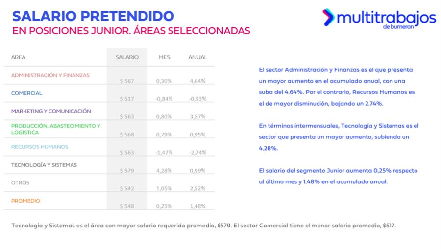 En el ámbito junior, el sector de Administración y Finanzas destaca con el mayor aumento anual, registrando un incremento del 4,64%. En contraste, Recursos Humanos experimenta la mayor disminución, con un decrecimiento del 2,74%. El promedio para los salarios requeridos, en nivel junior, registra un crecimiento del 1,48% en el acumulado anual.