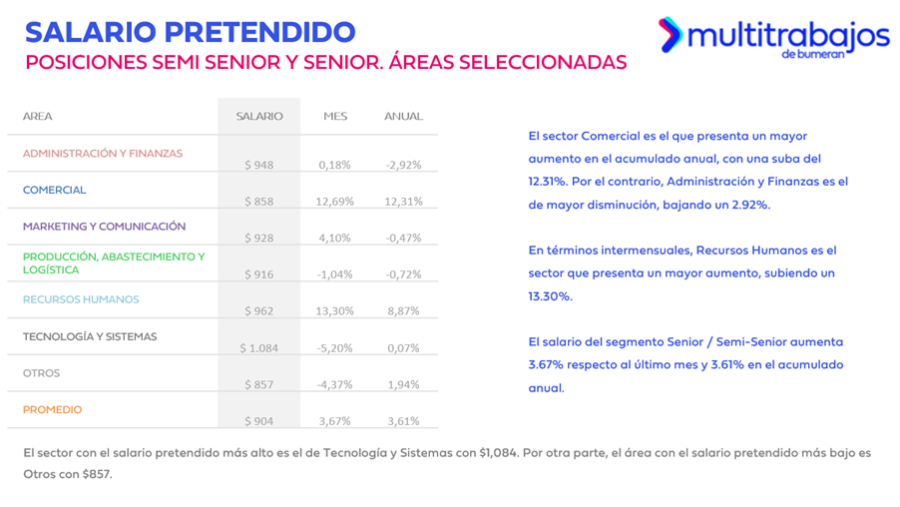 En el segmento semi senior y senior, el sector Comercial es el que presenta un mayor aumento acumulado anual, con un crecimiento del 12,31%. Por el contrario, Administración y Finanzas es el que más decreció, registrando un descenso del 2,92%. El promedio semi senior y senior tuvo un incremento del 3,61% en el acumulado anual.