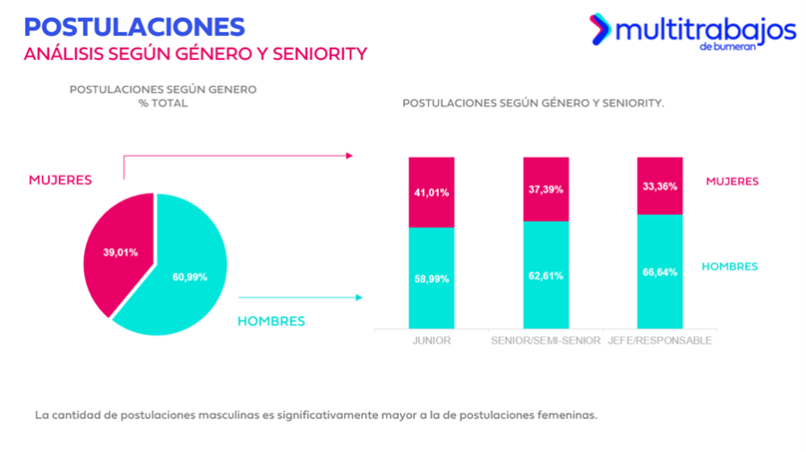 Al analizar las aplicaciones laborales, según el nivel de seniority, se observa que, en posiciones de jefe o supervisor, el 66,64% son hombres y el 33,36% mujeres; en cargos senior o semisenior, el 62,61% corresponden a hombres y el 37,39% a mujeres; y en puestos junior, el 58,99% son hombres y el 41,01% mujeres. Estos datos evidencian una clara tendencia: a medida que aumenta el nivel de seniority de los empleos, disminuye la participación femenina.