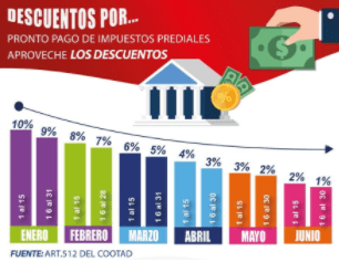 De su parte, ├üngel Arévalo, Director Financiero, dio a conocer que los usuarios que realicen los pagos en la primera quincena del mes de enero a junio, tendrán los descuentos que van desde el diez, ocho, seis, cuatro y dos por ciento, y los contribuyentes que hagan el pago en la segunda quincena de los meses mencionados, el descuento será de nueve, siete, cinco, tres y uno por ciento.┬á┬á