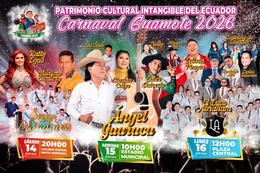 Sábado 14 de febrero de 2026: Desde las 20h00, en el Coliseo Rafael Brito Mendoza, se desarrollará la Elección y Coronación de la Reina del Carnaval de Guamote 2026. El evento contará con la presentación artística de reconocidos exponentes de la música nacional: