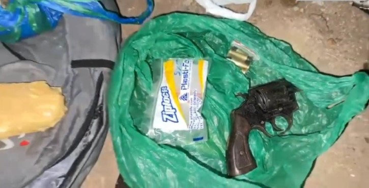 Entre los indicios encontrados se destacan: 221,88 gramos de marihuana, 81,93 gramos de cocaína, 4 tacos de dinamita, 1 arma de fuego tipo revólver, 5 cartuchos, y 2 balanzas digitales