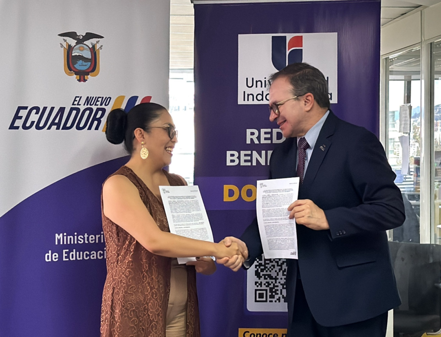 El rector de Indoamérica, Dr. Luis David Prieto y la Subsecretaria de Desarrollo Profesional Educativo del MINEDUC, María Belén Palacios, suscribieron el presente documento, cuyo objetivo es regular la implementación de los beneficios no remunerativos complementarios al salario a los que accederán los profesionales de educación a manera de reconocimiento y dignificación de la carrera docente, por parte de las personas naturales o jurídicas (aliado estratégico), así como la entrega de recepción de la información dentro del proceso de carnetización digital de los profesionales de educación del Magisterio Nacional.