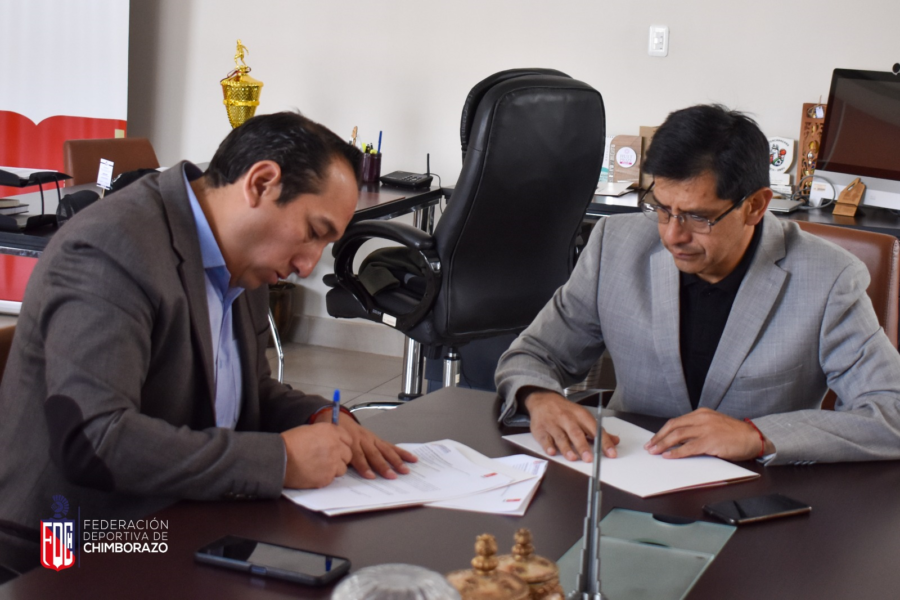 Christian Valdivieso, interventor de la Federación Deportiva de Chimborazo Y Byron Vaca, rector de la Escuela Superior Politécnica de Chimborazo (ESPOCH), firmaron un convenio de cooperación interinstitucional.