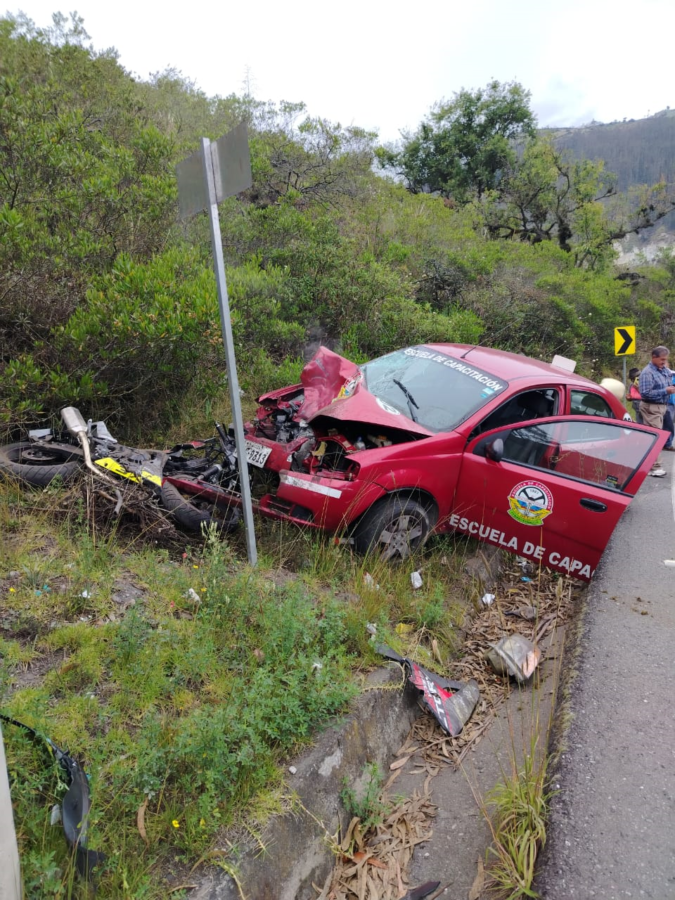 De acuerdo con versiones preliminares, el conductor de la motocicleta habría perdido pista en plena curva, presuntamente por exceso de velocidad, e impactó contra un vehículo perteneciente a la Escuela de Capacitación “4 de Octubre” del cantón Penipe.