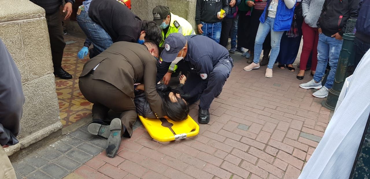 Los agentes de la Policía Nacional dieron los primeros auxilios a una mujer que se desmayó en pleno centro de Riobamba.┬á┬á┬á