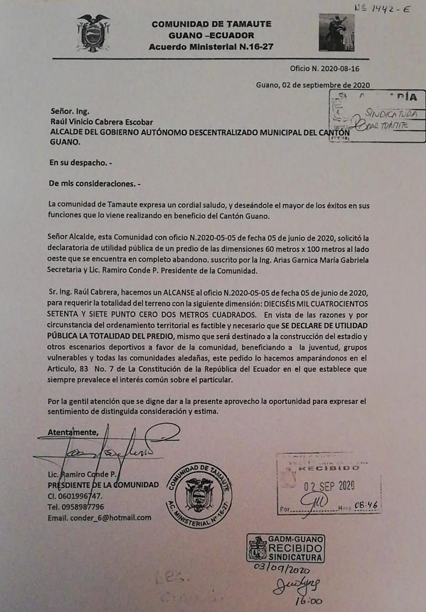 Ahora bien, cómo se llegó a esa decisión por parte de las autoridades municipales, pues todo habría surgido por la petición de ciertos pobladores de Tamaute, quienes, apoyados de su presidente de la comunidad, presentaron un proyecto ante el Municipio de Guano para la construcción de dicho estadio.