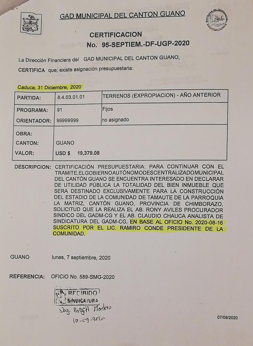 Rodríguez también denunció que al parecer el Municipio de Guano ha incumplido dentro del proceso varios aspectos, como la motivación, la singularización del terreno y el derecho a la defensa. “Nosotros iremos hasta las últimas instancias”, manifestó.