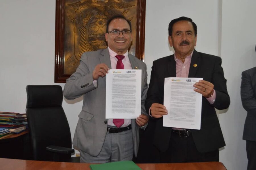 La firma se llevó a cabo en la Alcaldía de San Miguel de Bolívar y contó con la presencia del Dr. Arturo Rojas Sánchez, PhD, y el Dr. Vinicio Coloma Romero, Alcalde de San Miguel.