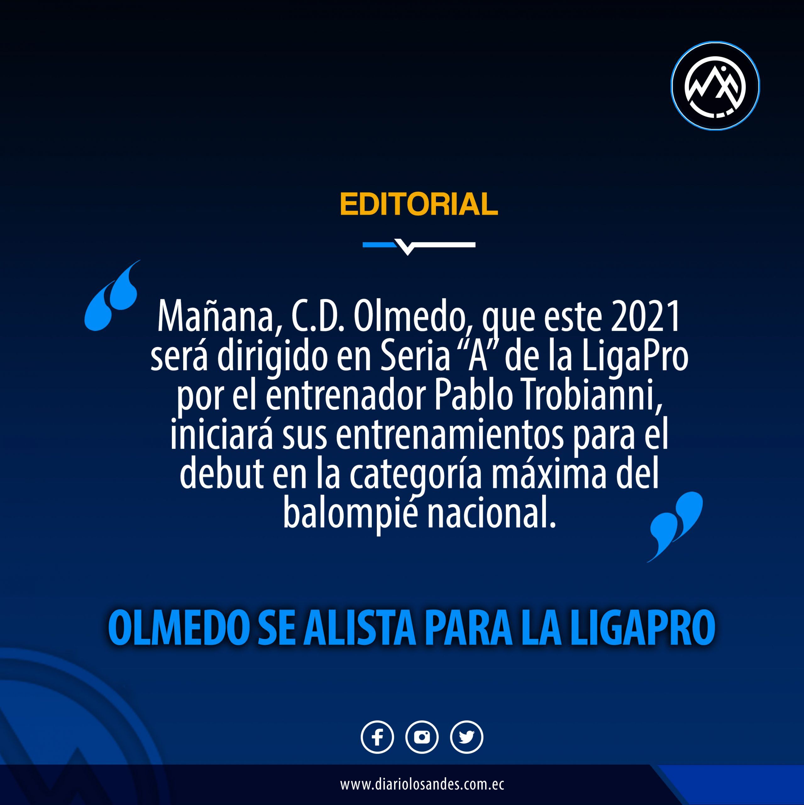 Mañana, C.D. Olmedo, que este 2021 será dirigido en Seria “A” de la LigaPro por el entrenador Pablo Trobianni, iniciará sus entrenamientos para el debut en la categoría máxima del balompié nacional.