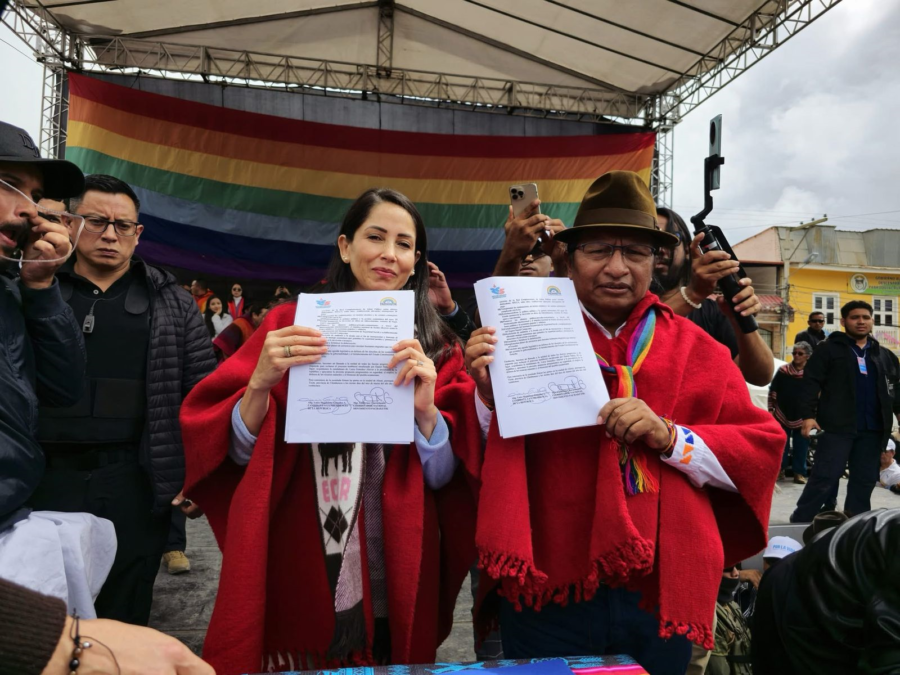 Desde la parroquia Tixán, en el cantón Alausí, provincia de Chimborazo, la candidata presidencial firmó el acuerdo junto al coordinador de Pachakutik, Guillermo Churuchumbi, y otros representantes de las comunidades indígenas y amazónicas.