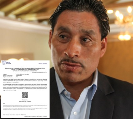 El prefecto de Chimborazo, Hermel Tayupanda, recibió el 11 de septiembre de 2025, un certificado oficial emitido por el Ministerio del Trabajo que confirma que no tiene inhabilidades ni impedimentos legales para ejercer cargos en el sector público.