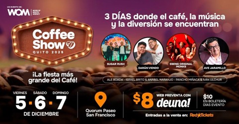 El Coffee Show 2025 se proyecta a ser más que una feria, será una experiencia cultural y sensorial que une a la comunidad cafetera y al público quiteño en torno a una pasión compartida. En un solo espacio, el aroma del café, la creatividad de sus protagonistas y el espíritu festivo de Quito se fusionarán para rendir homenaje a una de las tradiciones más queridas del país.