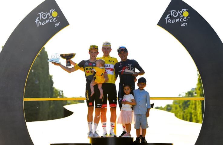 Jonas Vinegaard, Tadej Pogacar Richard Carapaz celebran en el podio tras la 21a etapa del Tour de Francia 2021.