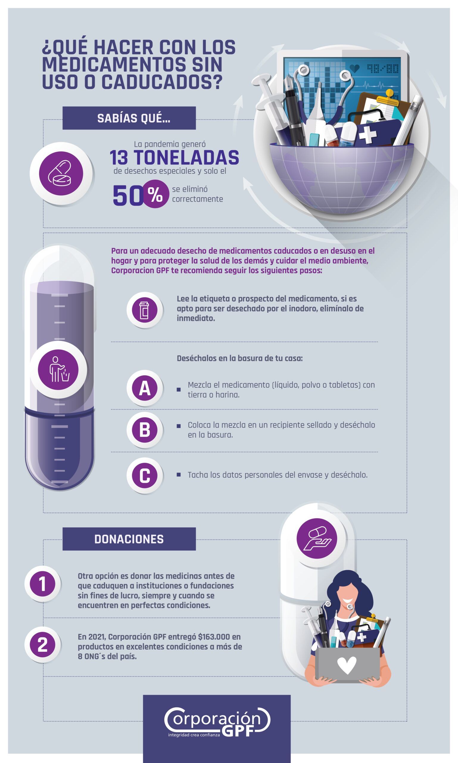 Corporación GPF recomienda seguir los siguientes pasos para desechar medicamentos en casa: